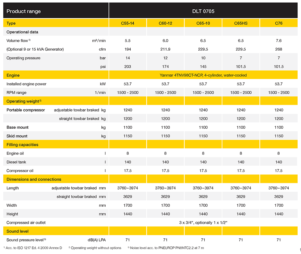 Thanks to a wide pressure range up to 14 bar, this compact compressor range is extremely versatile and meets the requirements of numerous applications. The compressors have enough storage capacity for two hammers, picks or any other pneumatic tools. Separate engine and compressor air filters guarantee a long service life. All of the service points are strategically located for easy access.
