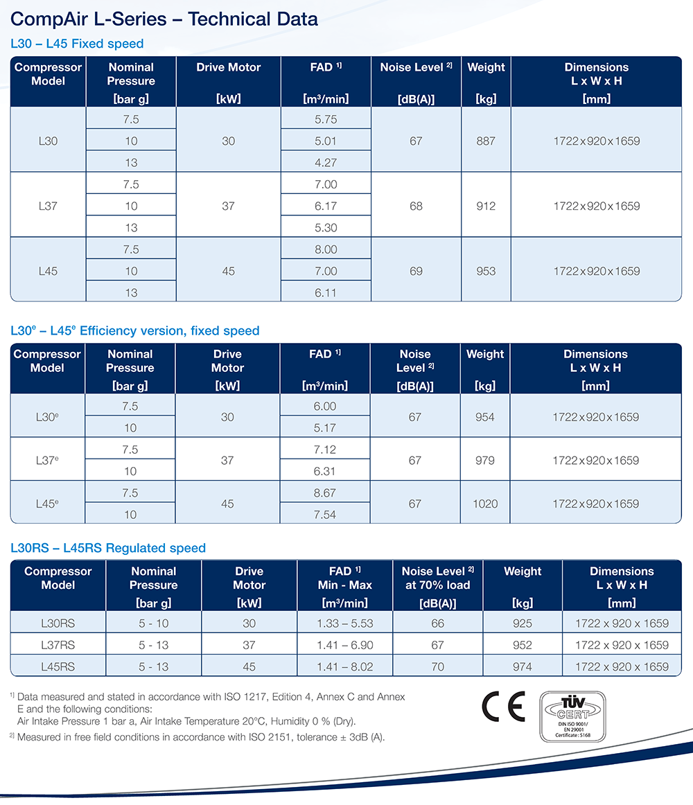 The E-Models of the L-Series screw compressors feature an extra large airend with optimised rotor tip speed achieving up to 6% energy savings.